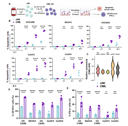 該研究首先從健康供體的外周血中分離出NK細胞,并通過特定細胞因子(IL-12、IL-18和IL-15)的短暫激活,誘導(dǎo)其轉(zhuǎn)化為具有記憶樣特性的CIML NK細胞。CIML NK細胞與EOC 細胞系(OVCAR8、SKOV3、OVCAR3、CaOV3 、 CaOV4)共培養(yǎng)6小時后,在體外實驗中顯示出了增強的細胞毒性、脫顆?;?/font>CD107a)和干擾素γ(IFN-γ)產(chǎn)生,預(yù)示著其在抗腫瘤活性方面的潛力。