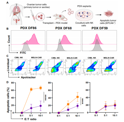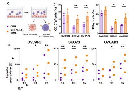 隨后,研究團隊設(shè)計了一種新型的CAR,專門靶向EOC中高表達的MSLN蛋白的膜近域。通過狒狒慢病毒(Baboon lentivirus,BaLV)介導(dǎo),成功將MSLN-CAR基因轉(zhuǎn)導(dǎo)入CIML NK細胞,制備出MSLN-CAR CIML NK細胞。這些細胞在體外實驗中對EOC細胞系顯示出顯著的細胞毒性和激活狀態(tài)。在體外實驗中,MSLN-CAR CIML NK細胞對EOC細胞系(包括OVCAR8、SKOV3和OVCAR3)表現(xiàn)出了顯著的細胞毒性。與未轉(zhuǎn)導(dǎo)的CIML NK細胞相比,MSLN-CAR CIML NK細胞在與EOC細胞系共培養(yǎng)后,顯示更高表達的CD107a和IFN-γ,表明其具有更強的抗腫瘤活性。